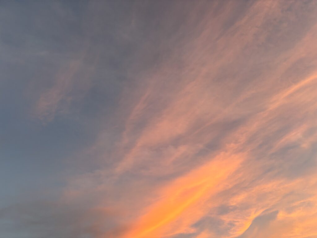 Mon horaire de travail me permet moins de voir naître le jour et ces levers qui reprennent la même théorie des ondes qui franchissent les couches de l’atmosphère, mais il y a ainsi, toutes les 24 heures sur Terre, deux offrandes de beauté pour envelopper le ciel malgré ce lourd, ce laid et ce triste dans lesquels on peut baigner.