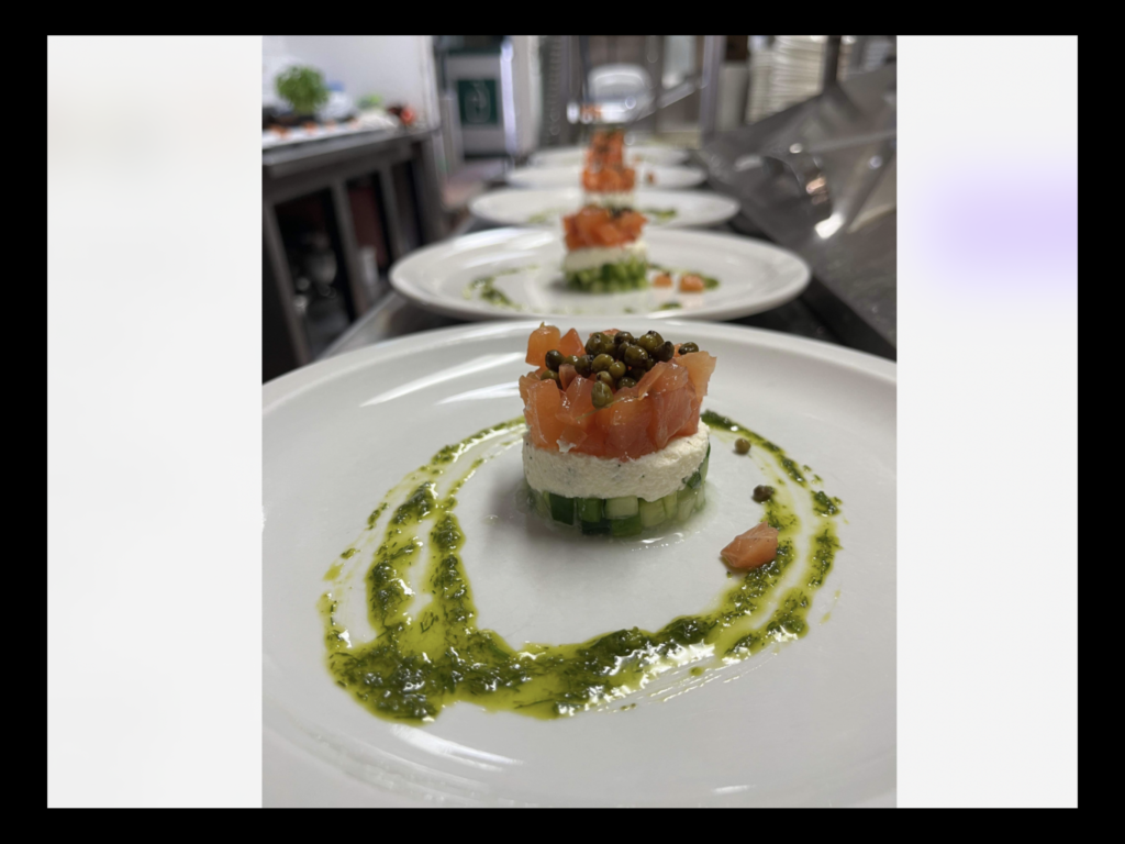 - Juste avant le service, couper le gravlax en petits dés et réserver.