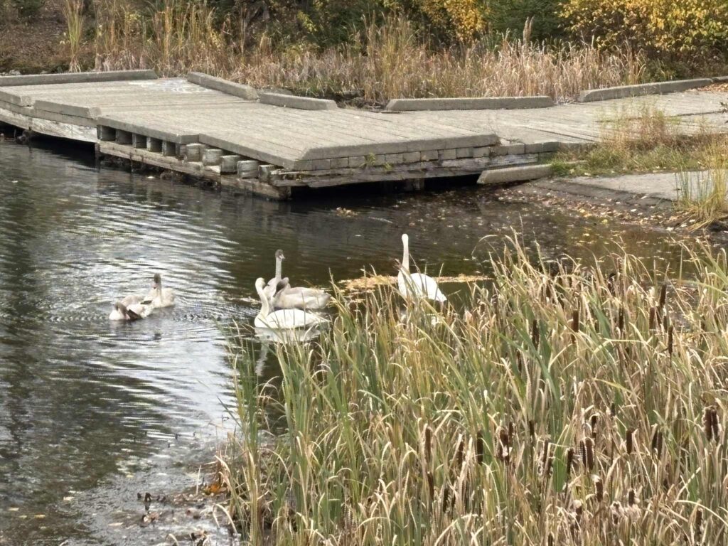 Le détour, plus près, s’imposait, tout en douceur pour éviter qu’ils ne s’envolent. À mesure que je m’approchais à pas feutrés et qu’à travers les herbes hautes et les branchages, je pouvais mieux distinguer, apprécier la scène, j’ai pu alors observer, non pas deux, mais quatre cygneaux au plumage encore gris qui se tenaient comme des raisins en grappes. Rare spectacle que d’avoir ainsi une flottille de cygnes.
