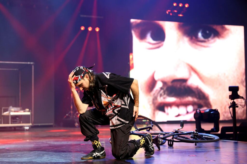Tout juste laissé par sa blonde, Jerry tente de « travailler sur luimême » pour retrouver l’amour. Pour y arriver, il interroge le public, l’inclut dans ses réflexions et se met souvent dans des situations surprenantes. Devant nous, un spectacle participatif se construit, porté par un homme de 36 ans gêné, maladroit et peu à l’aise avec les codes sociaux. Pour prouver sa valeur, il enchaîne les numéros de vélo, d’acrobatie et de jonglerie. L’humour sert de fil conducteur à cet ensemble qui tient étonnamment bien, malgré les doutes qui nous traversent parfois devant la fragilité de l’égo de Jerry.